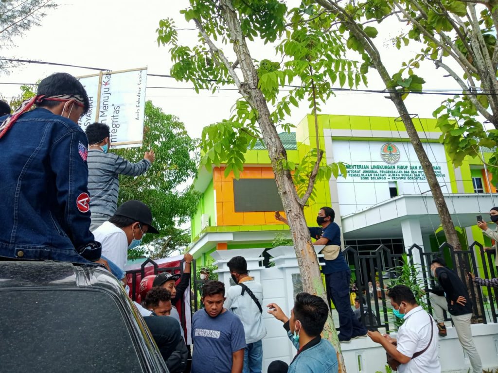 Masa aksi berorasi di depan kantor Balai Pengelolaan Daerah Aliran Sungai Dan Hutan Lindung Bone Bolango-Provinsi Gorontalo, Rabu (16/06/2021).