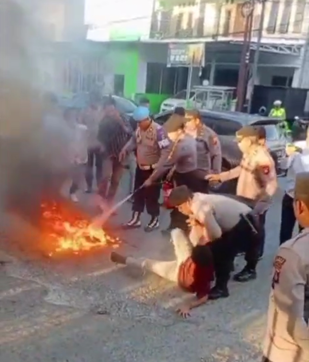 “Tidak ada dorongan atau tindakan represif yang dilakukan anggota Polri. Yang bersangkutan jatuh sendiri ketika menghalangi proses pemadaman api,” jelas pihak kepolisian dalam keterangannya.