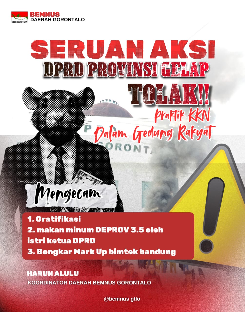 Koordinator Daerah BEMNUS Gorontalo, Harun Alulu, mengungkapkan bahwa aksi ini merupakan respons mereka terhadap maraknya dugaan gratifikasi dan penyimpangan di lembaga legislatif tersebut.