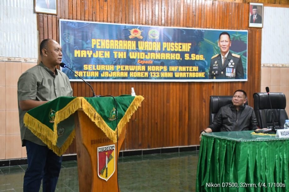 RELATIF.ID, GORONTALO__Danrem 133/Nani Wartabone Brigjen Totok Sulistyono, S.H., M.M., M.I.P., hadiri kegiatan Pengarahan Wadanpussenif Mayjen TNI Widjanarko, S.Sos., kepada seluruh Perwira Korps Infanteri Satuan Jajaran Korem 133/NW, bertempat di Aula Otanaha Kodim 1304/Gorontalo Jl. Nani Wartabone, Kel. Biawao, Kec. Kota Selatan, Kota Gorontalo, Rabu (21/06/2023).