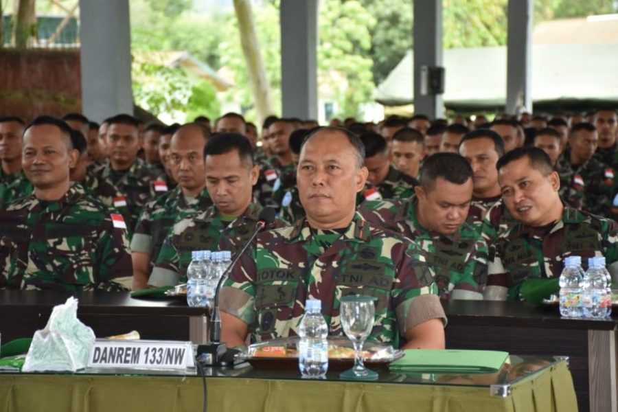 RELATIF.ID, GORONTALO__Komandan Korem (Danrem) 133/Nani Wartabone Brigjen TNI Totok Sulistyono, S.H., M.M., M.I.P didampingi Kasrem bersama para Kasi Kasrem 133/NW mengikuti kegiatan vicon kepada personel Yonif 713/Satya Tama yang akan melaksanakan Latpratugas Satgas BGC TNI KONGA XXXIX-E/MONUSCO
