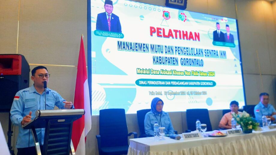 RELATIF.ID, GORONTALO – Kepala Dinas Perindustrian dan Perdagangan (Disperindag) Kabupaten Gorontalo, Dr. Viktor Asiku, S.STP, M.Si, resmi membuka Pelatihan Manajemen Mutu dan Pengelolaan Sentra Industri Kecil Menengah (IKM) yang diselenggarakan di salah satu hotel ternama yang ada di Kota Gorontalo, (30/09/2024)