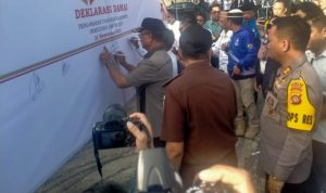 “Menghimbau kepada seluruh peserta pemilu agar tidak melakukan pelanggaran baik itu menyebarkan berita hoax, politik uang dan politik yang bernuansa sara, kampanye hitam serta politik adu domba. Mari bersama mensukseskan pemilu tahun 2024 menjadi pemilu damai,aman tertib dan berintegritas”. Tandasnya.
