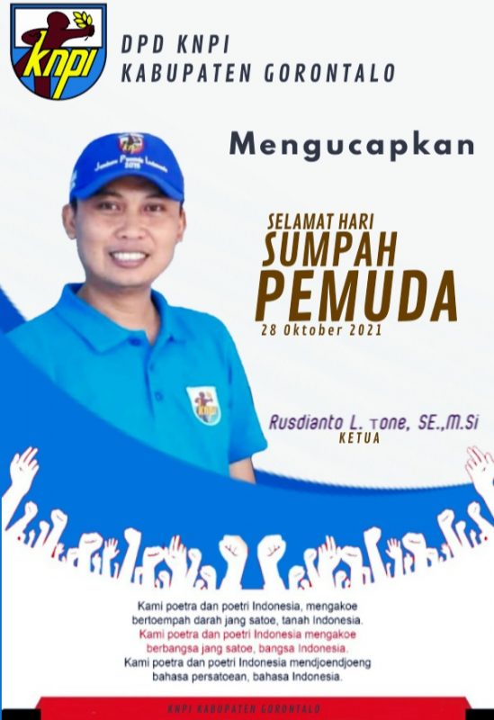 RELATIF.ID, KABUPATEN GORONTALO__Melalui momentun hari sumpah pemuda ketua DPD Komite Nasional Pemuda Indonesia (KNPI) Kabupaten Gorontalo, Rusdianto Tone mengharapkan semangat pemuda harus terus digelorakan. Karena menurutnya, peran pemuda begitu sangat signifikan pada sejarah Bangsa dan Negara Republik Indonesia. Dimana pemuda berada pada garda terdepan baik sebagai agen perubahan dan juga sebagai agen pembangunan.