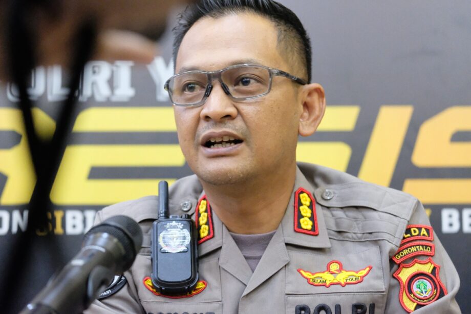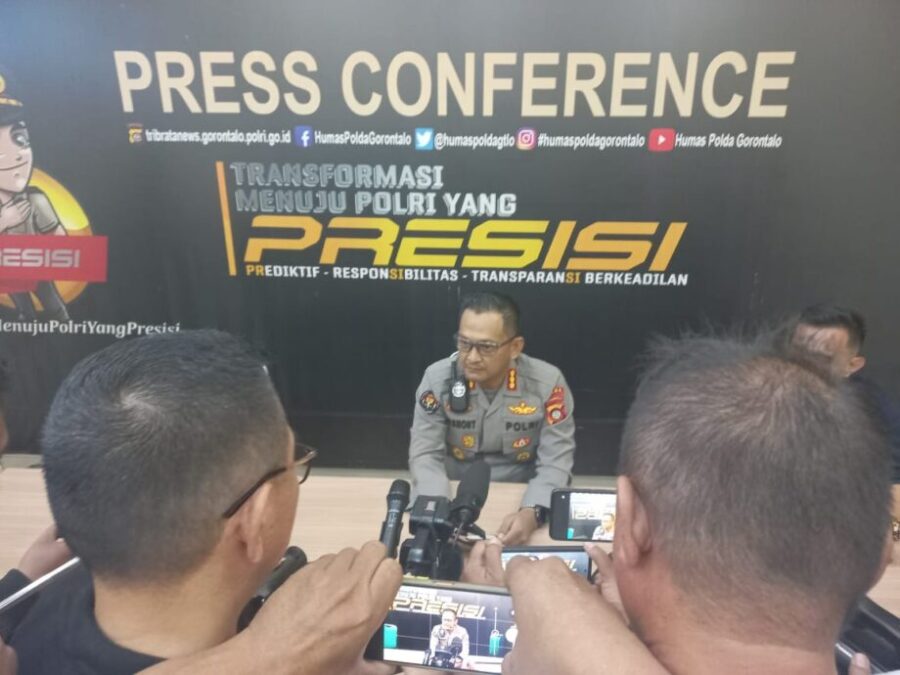 RELATIF.ID, GORONTALO__Kabid Humas Polda Gorontalo, Kombes Pol. Desmont Harjendro A.P., SIK., MT., memimpin jalannya press Conference tentang penggeledahan dan penyitaan minuman keras yang di lakukan Kapolda Gorontalo Irjen Pol. Drs. Angesta Romano Yoyol, MM., di Desa Dungaliyo, Kecamatan Dungaliyo, Kabupaten Gorontalo. Selasa malam (18/072023).