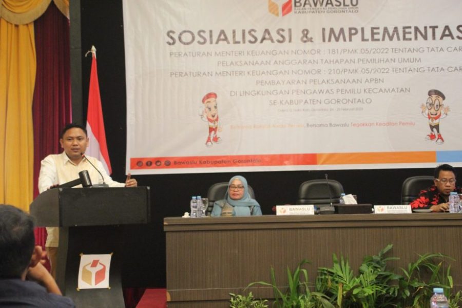 RELATIF.ID, GORONTALO___Badan Pengawas Pemilihan Umum Kabupaten Gorontalo Gelar Sosialisasi dan Implementasi Peraturan Menteri Keuangan (PMK) Tentang Tata Cara Pelaksanaan Anggaran Tahapan Pemilihan Umum (Pemilu). Jum’at (24/02/2023).
