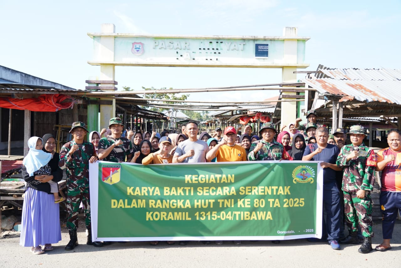 RELATIF.ID, GORONTALO – Komando Distrik Militer (Kodim) 1315/KG melalui Komando Rayon Militer (Koramil) 1315-04/Tibawa bersama masyarakat melaksanakan kegiatan Karya Bakti pembersihan Pasar Rakyat Desa Datahu, Kecamatan Tibawa, Kabupaten Gorontalo.