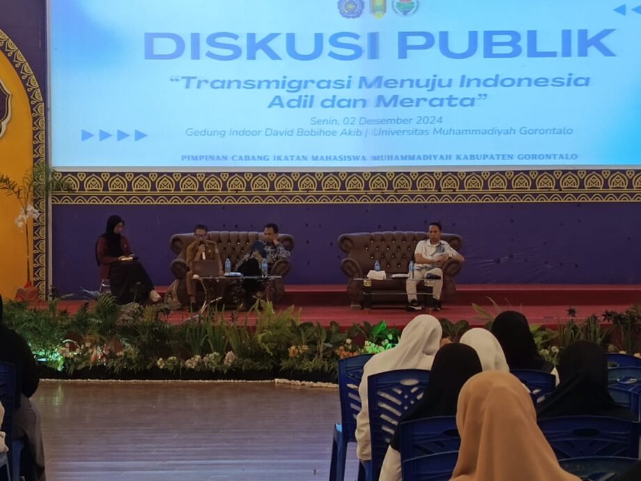 RELATIF.ID, GORONTALO – Pimpinan Cabang Ikatan Mahasiswa Muhammadiyah (PC IMM) Kabupaten Gorontalo menggelar diskusi publik bertajuk Transmigrasi Menuju Indonesia Adil dan Merata di Gedung Indoor David Bobihoe Akib Universitas Muhammadiyah Gorontalo (UMGo), Senin (2/12/2024).