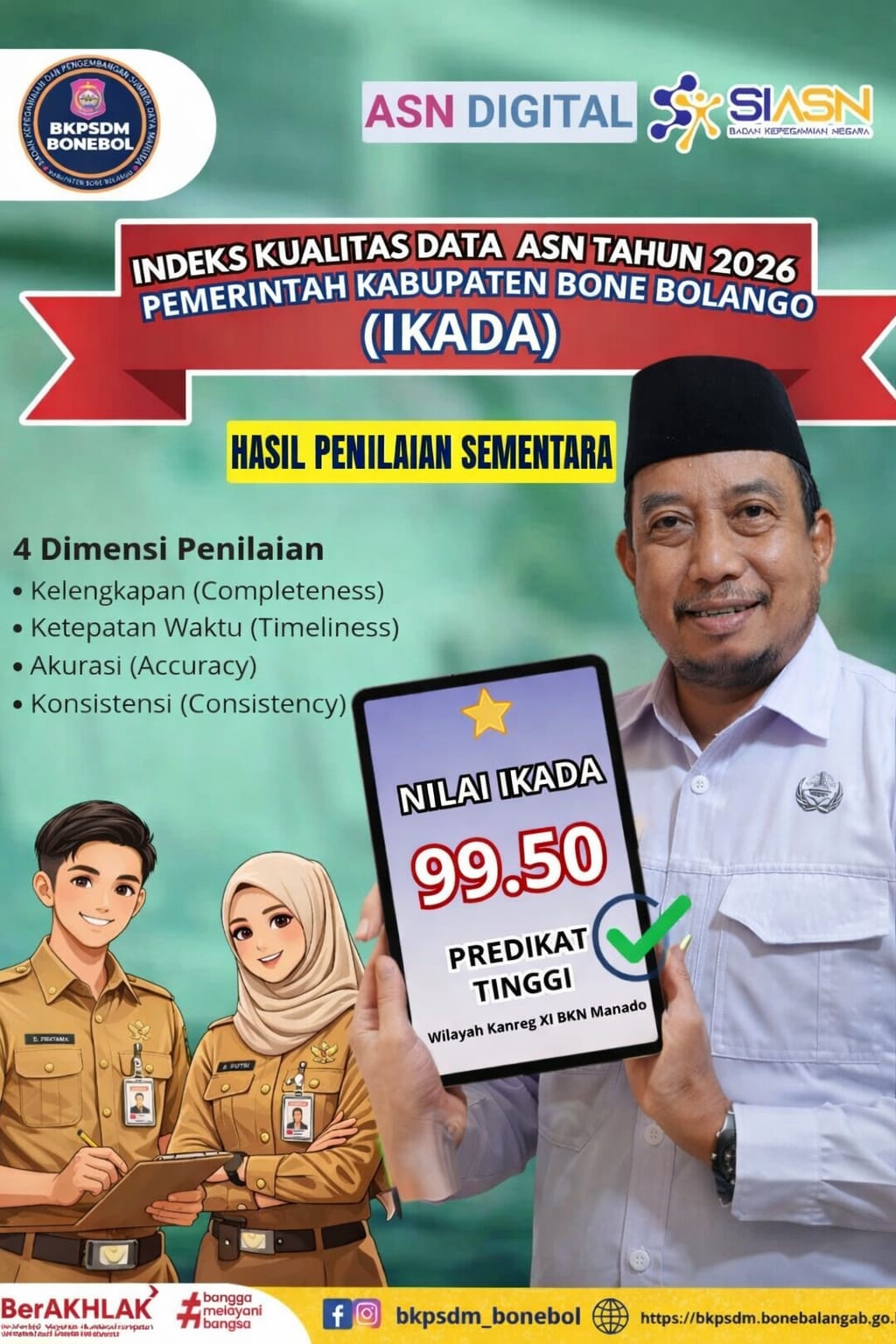 Berdasarkan hasil penilaian sementara Indeks Kualitas Data Aparatur Sipil Negara (ASN) Tahun 2026 yang dirilis Badan Kepegawaian Negara (BKN), Pemkab Bone Bolango meraih skor 99,50 dengan kategori “Tinggi”.