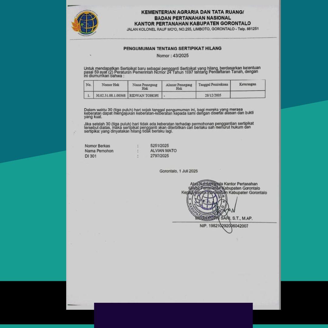 RELATIF.ID, GORONTALO – Kementerian Agraria dan Tata Ruang Badan Pertahanan Nasional melalui Kantor Pertanahan Kabupaten Gorontalo mengumumkan hilangnya sertifikat tanah atas nama pemegang hak, Ridwan Tohopi, dengan nomor 43/2025, tanggal pembukuan 28/12/2005.