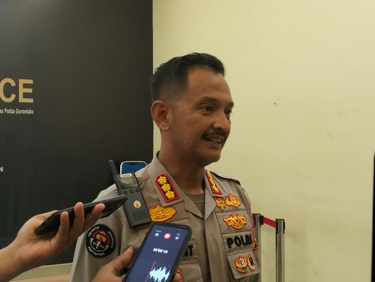 Kabid Humas Polda Gorontalo, Kombes Pol Desmont Harjendro saat diwawancarai (HO/Yakub).