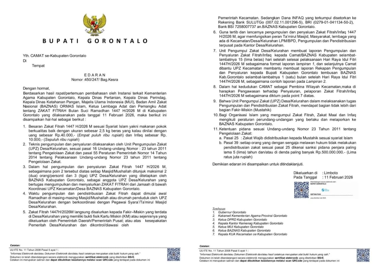 Berdasarkan Surat Edaran Nomor: 450/247/Bag.Kesra tertanggal 11 Februari 2026, Pemerintah Kabupaten Gorontalo resmi menetapkan zakat fitrah sebesar Rp40.000 dan infak sebesar Rp10.000 untuk Ramadan 1447 Hijriah/2026 Masehi.